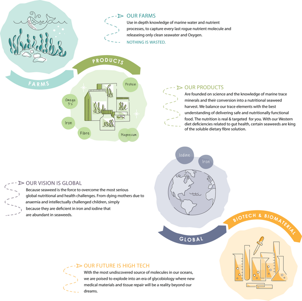 We capture these and harness their nutritional power for our seaweed farm, returning and keeping them in the food chain, closing the loop in a sustainable industrial ecology system.